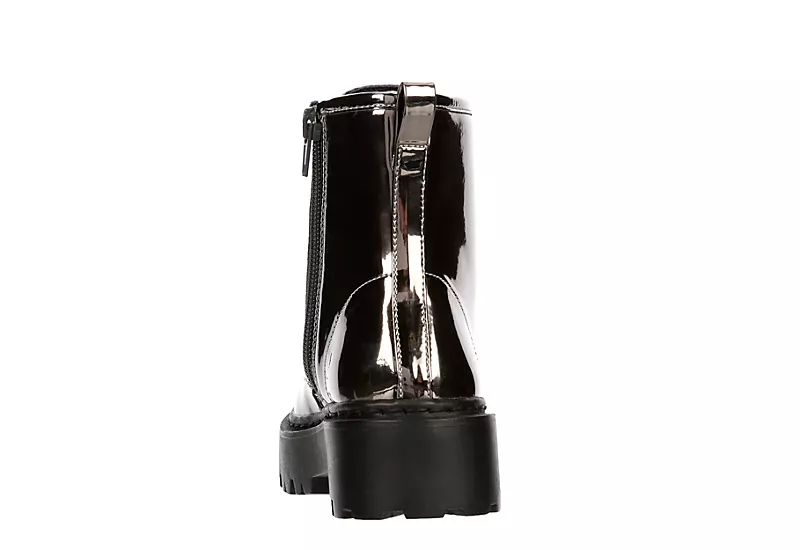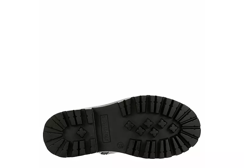Never deny her gloss in the Steve Madden Jrockk girls’ combat boot. With a synthetic upper featuring rear pull tab for easy entry, this inside zip boot also has a laced front for a traditional look. The textile lining soothes her foot while that chunky outsole adds sass and traction in equal parts.